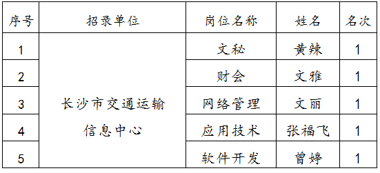 2019年長沙市交通運輸局所屬事業單位公開招聘工作人員,經報名、筆試、資格審查、面試、體檢、考察等程序,按照《2019年長沙市交通運輸局所屬事業單位公開招聘工作人員簡章》等相關規定,擬錄取以下5人。