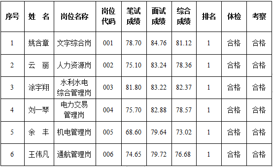 ?長沙市湘江綜合樞紐工程辦公室2020年公開招聘工作人員,經報名、資格初審、筆試、資格復審、面試、體檢、考察等程序,按照《招聘簡章》相關規定擬錄取以下6人,現公示如下,公示期為7個工作日。