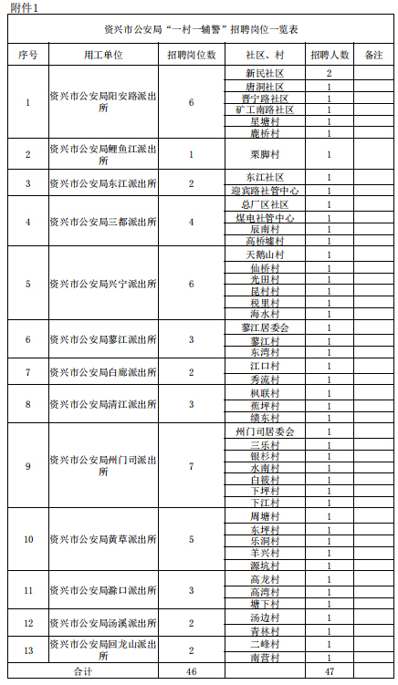 一村一輔警47名,主要從事駐村輔警工作。具體招聘崗位、人數見附件1.