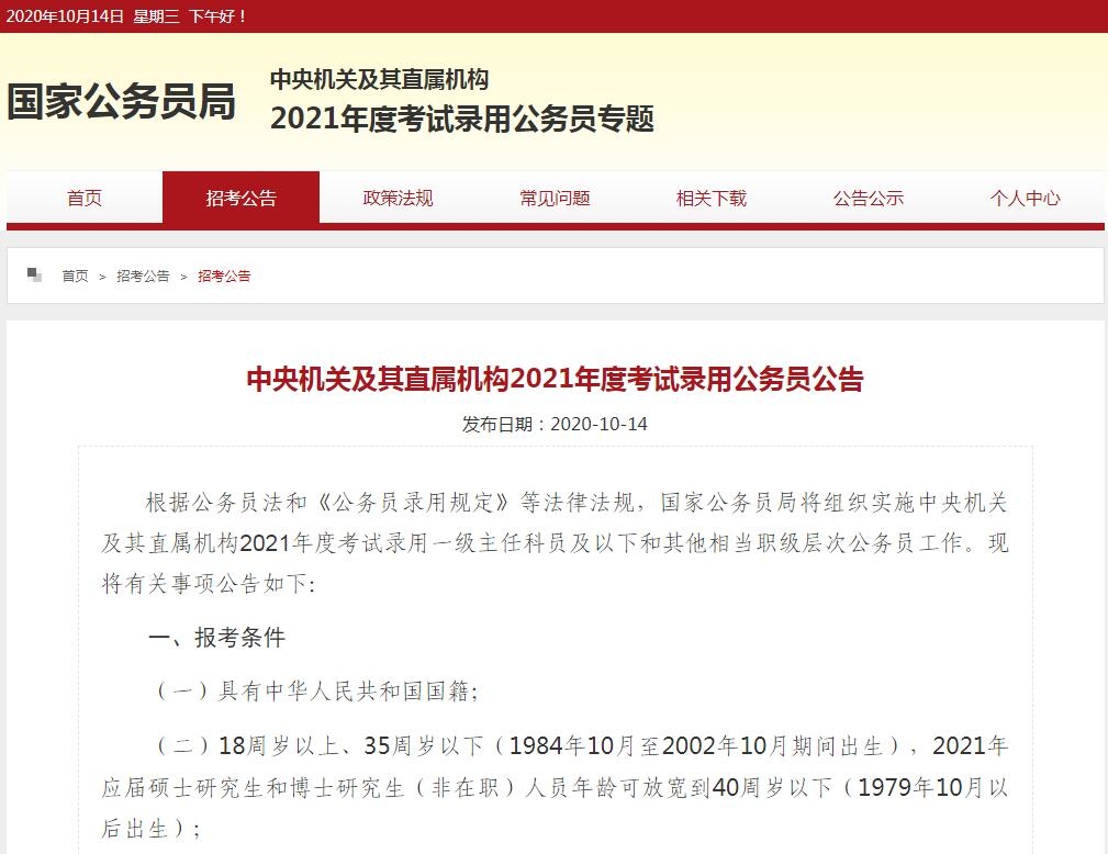 2021年國家公務員考試于10月14日公布招考公告,中央機關及其直屬機構2021年度公務員招考報名即將開始,本次招考共有79個部門、23個直屬機構參加,計劃招錄2.57萬人。